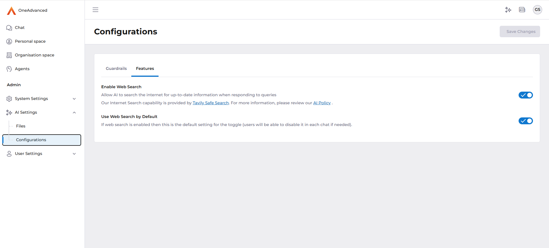 Enable Web Search | This setting enables or disables the web search feature for your organisation. When toggled off, the 'Search the web' toggle in the chat interface will be read-only and set to off. When toggled on, the 'Search the web' toggle will be available for users to interact with. |