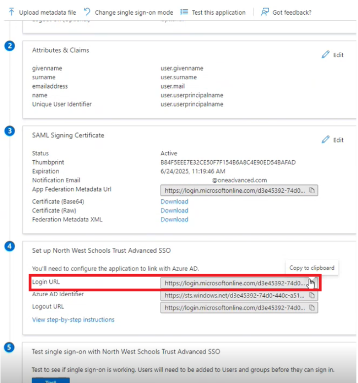 Before you leave this page, there is some information you need to copy from this page. Scroll down to the section labelled "Set up [Application name]", and copy the value next to Login URL. Save this for later as you will need it when you come back to MyWorkplace: