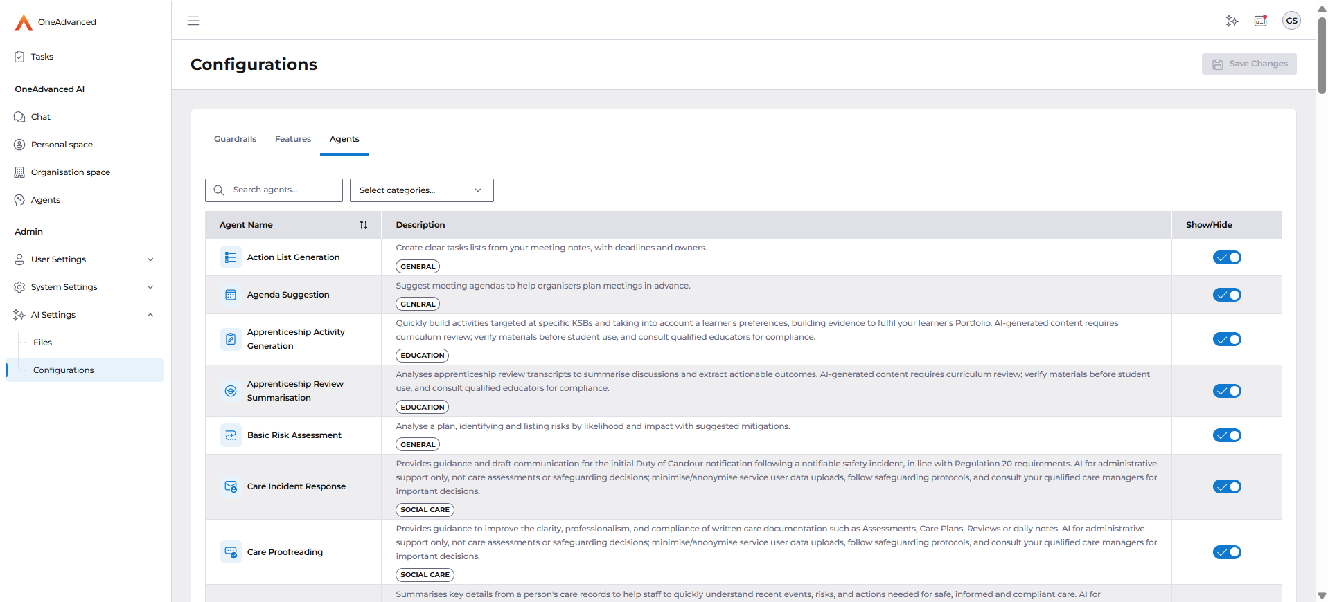 Organisation Admin users now have the ability to manage the prebuilt agents available to your organisation within OneAdvanced AI. The Agents configuration settings screen allows you to enable or disable these agents at an organisation level.