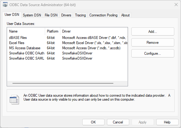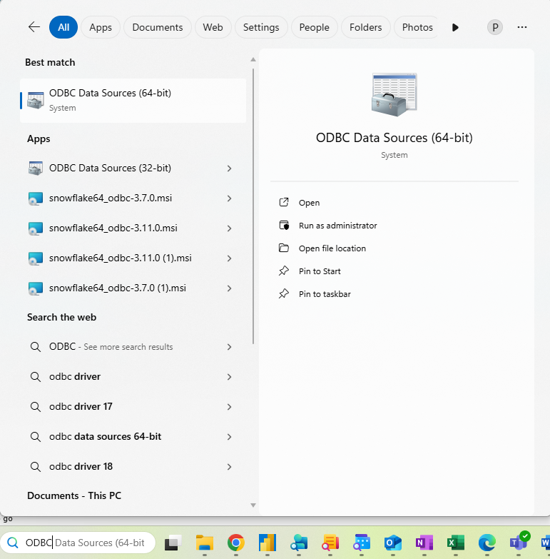 Note: OneAdvanced is also aware of third-party Snowflake ODBC drivers. Only the official Snowflake supplied driver is supported by OneAdvanced. - Launch the Windows Data Source Administration Tool: