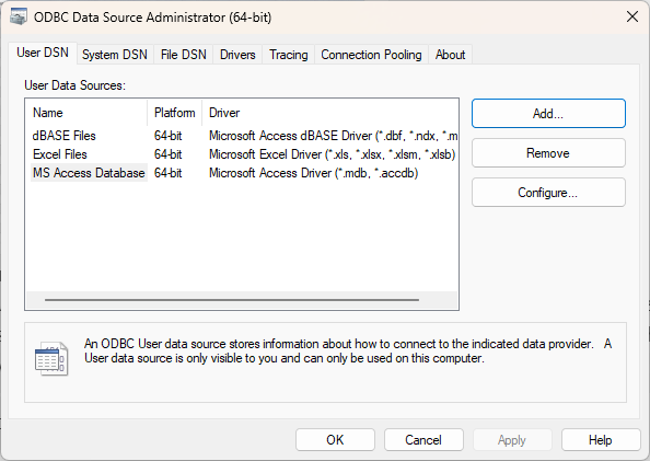- Click on the User DSN or System DSN tab and click the Add button: