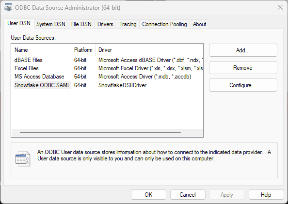 - Verify that the Snowflake ODBC driver is installed: