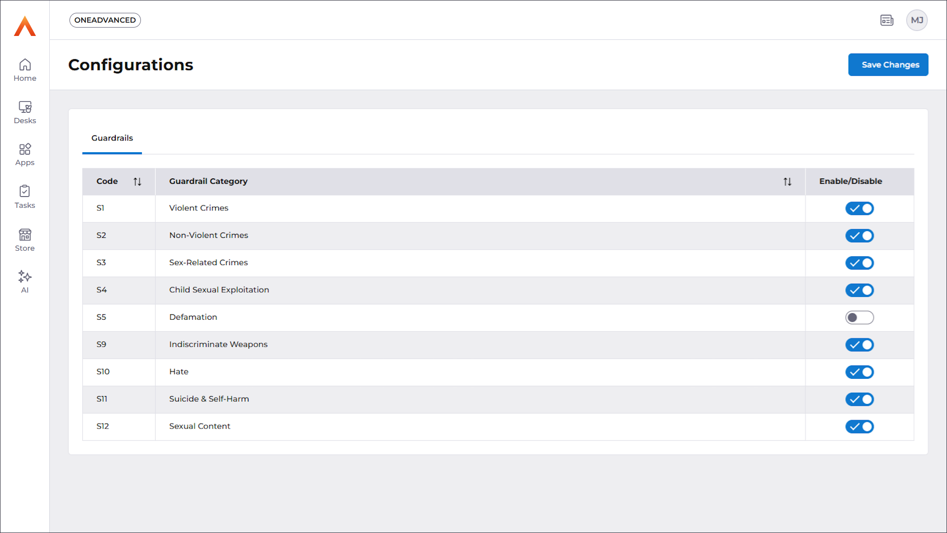 This article will show you, as an admin user, how to configure your organisation's guardrails. Guardrails are used to restrict the subjects that OneAdvanced AI will be allowed to engage with. The categories are taken from the ML Commons taxonomy of AI Hazards. To configure your organisation's guardrails;