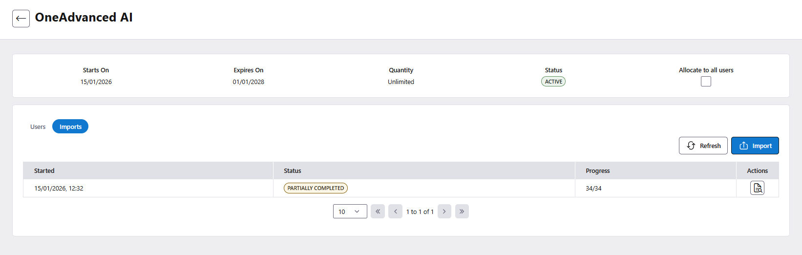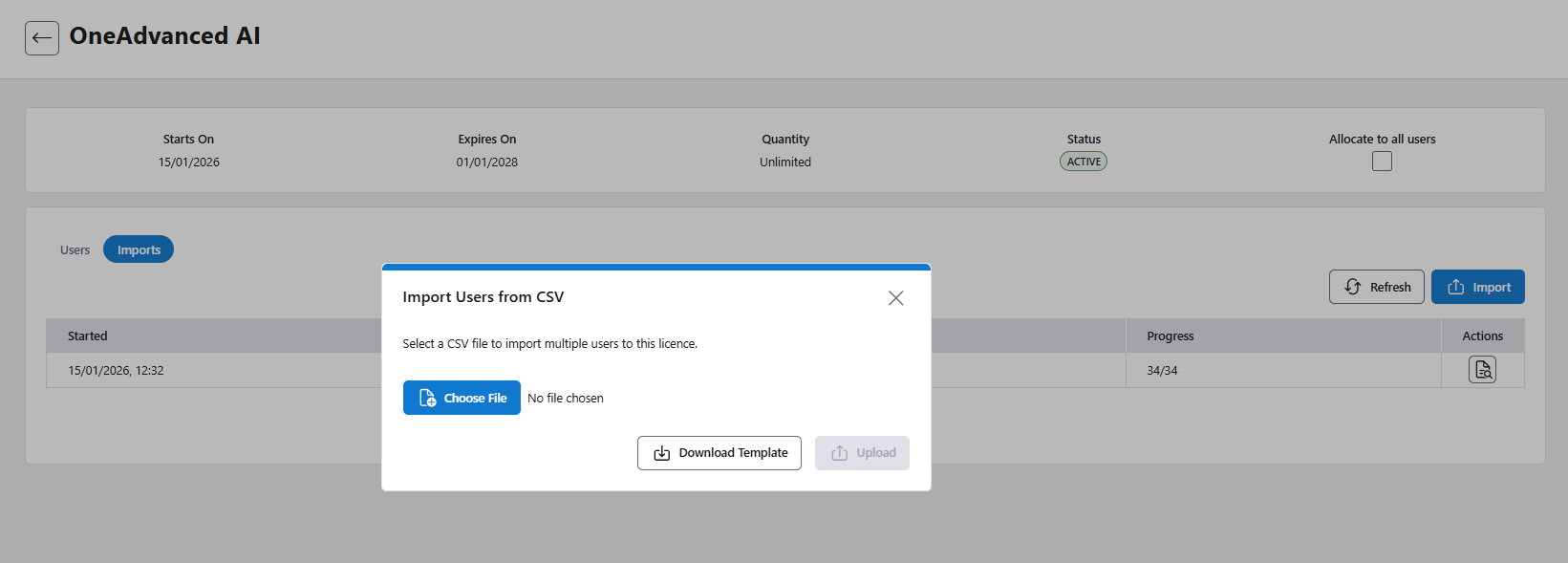 Navigate to the Imports tab on the licence details page and click import button to download template