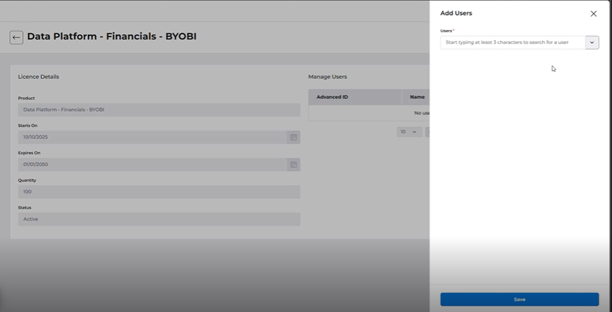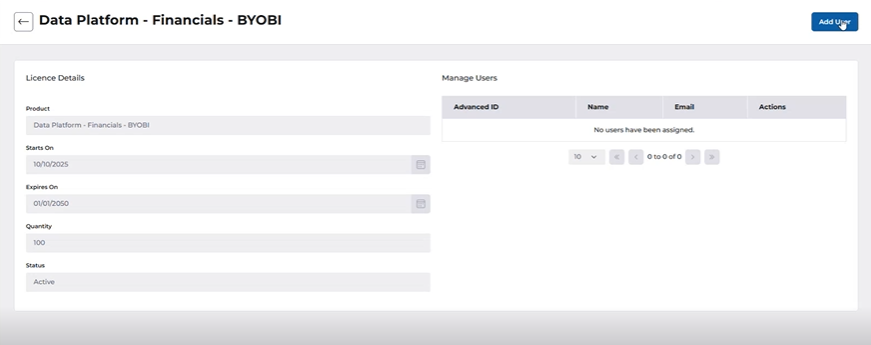 A user is granted access to the BYOBI or Data Share service through the allocation of a licence to the relevant BYOBI or Data Share product to their OneAdvanced Identity user account.
